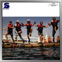 Mit dem Schrittgurt ist der Sitz der Weste, besonders aufgeblasen im Wasser, feiner zu justieren. Die Optimierung der Auftriebsverteilung hebt den Kopf höher aus dem Wasser.